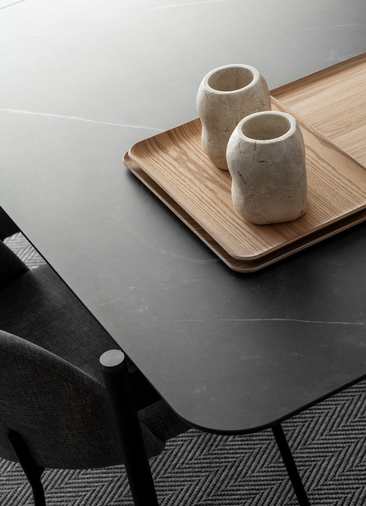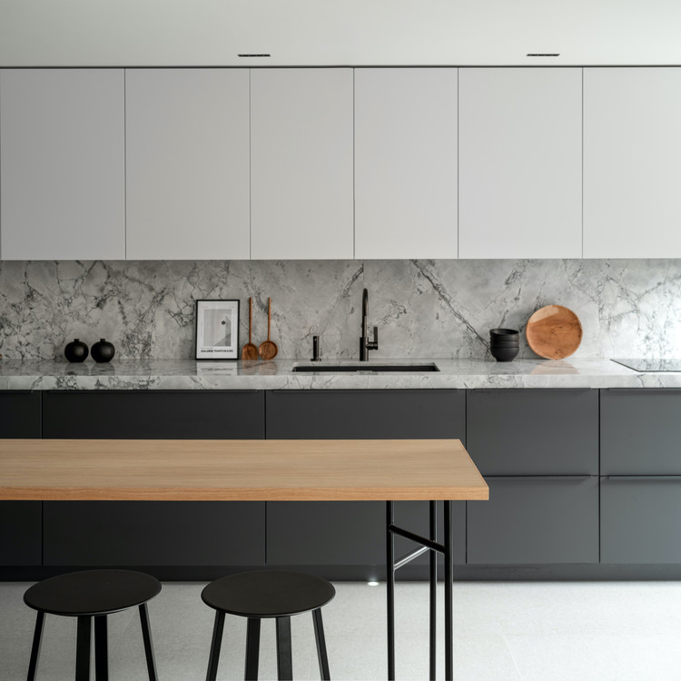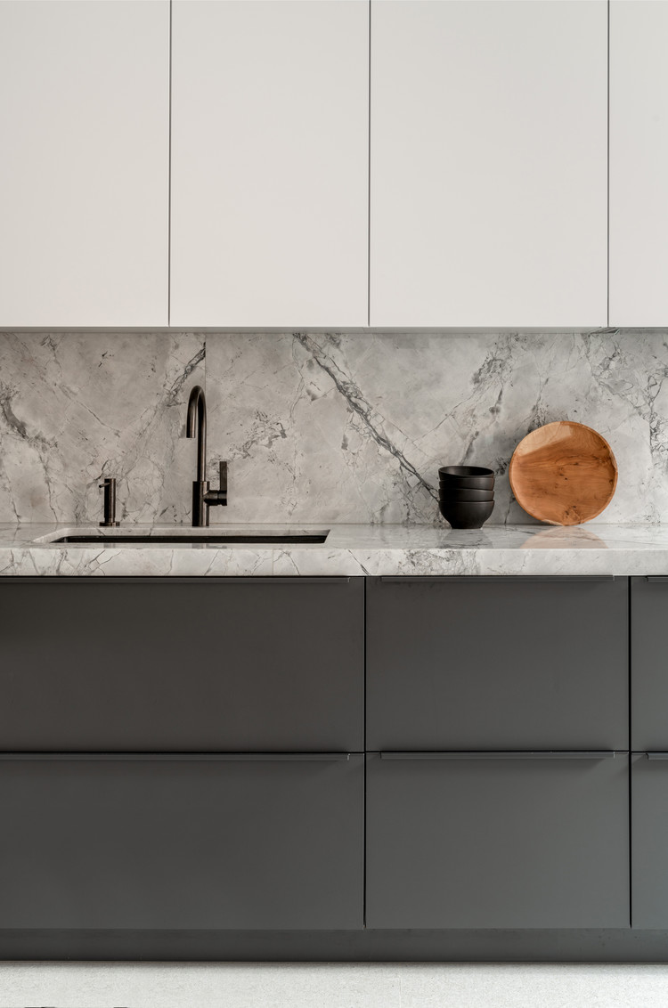 Creemos que la arquitectura debe acompañar todo eso, con el tratamiento del espacio, la luz y los materiales. Entre estos últimos, destaca absolutamente la piedra natural, un granito veteado que construye la encimera de trabajo, que refleja parcialmente la luz, de una manera mágica y proporciona un telón de fondo espectacular. El mobiliario es mate, acabado con un lacado especial, suave y duradero.