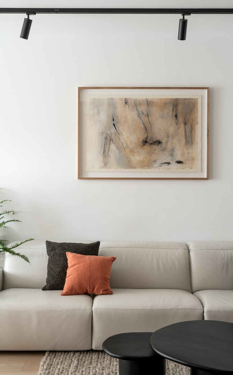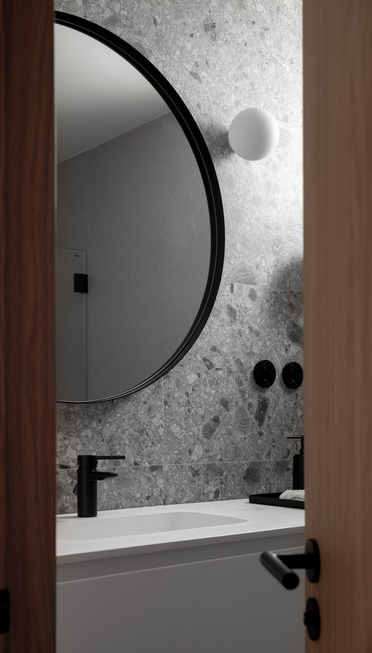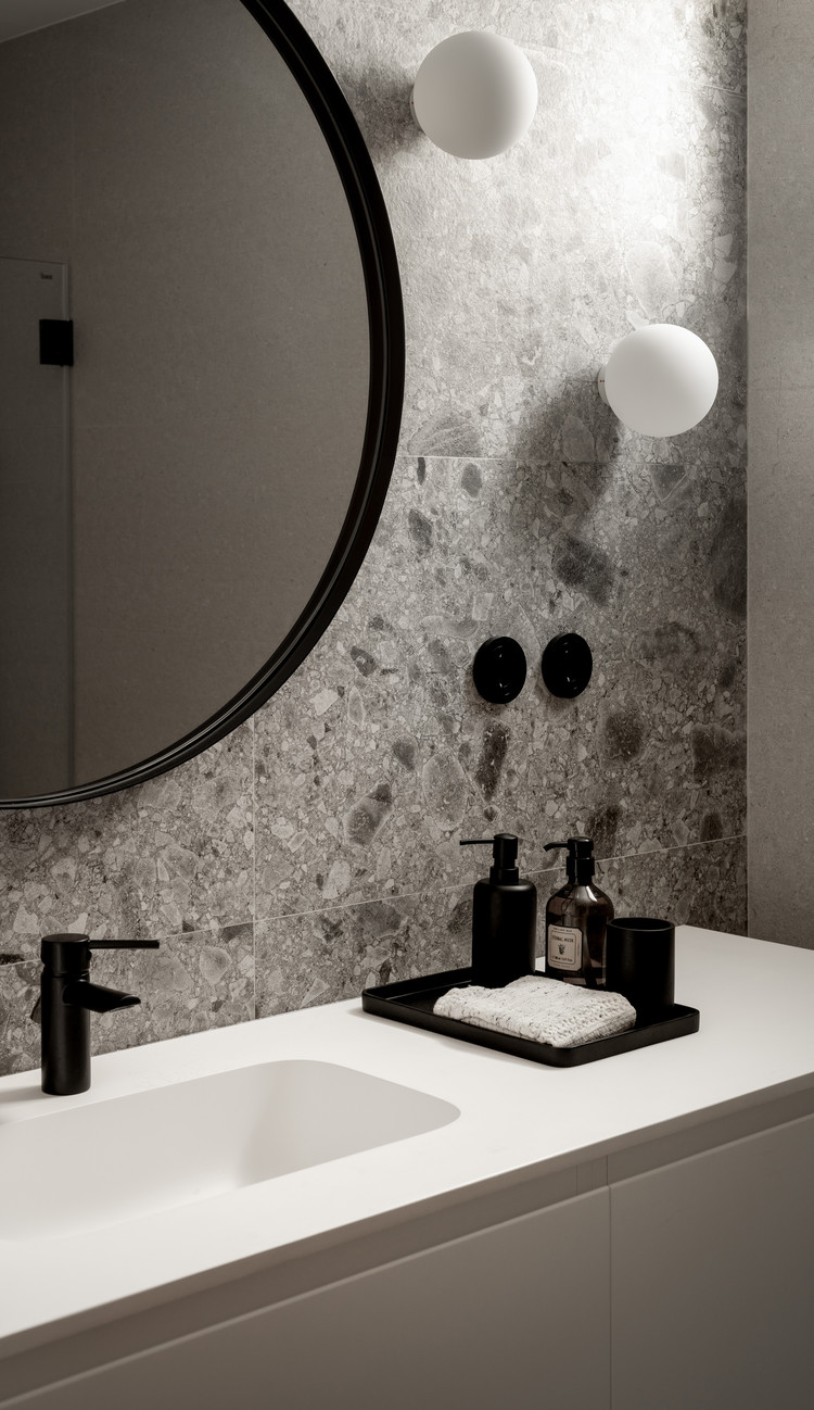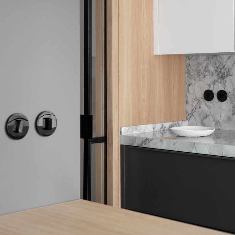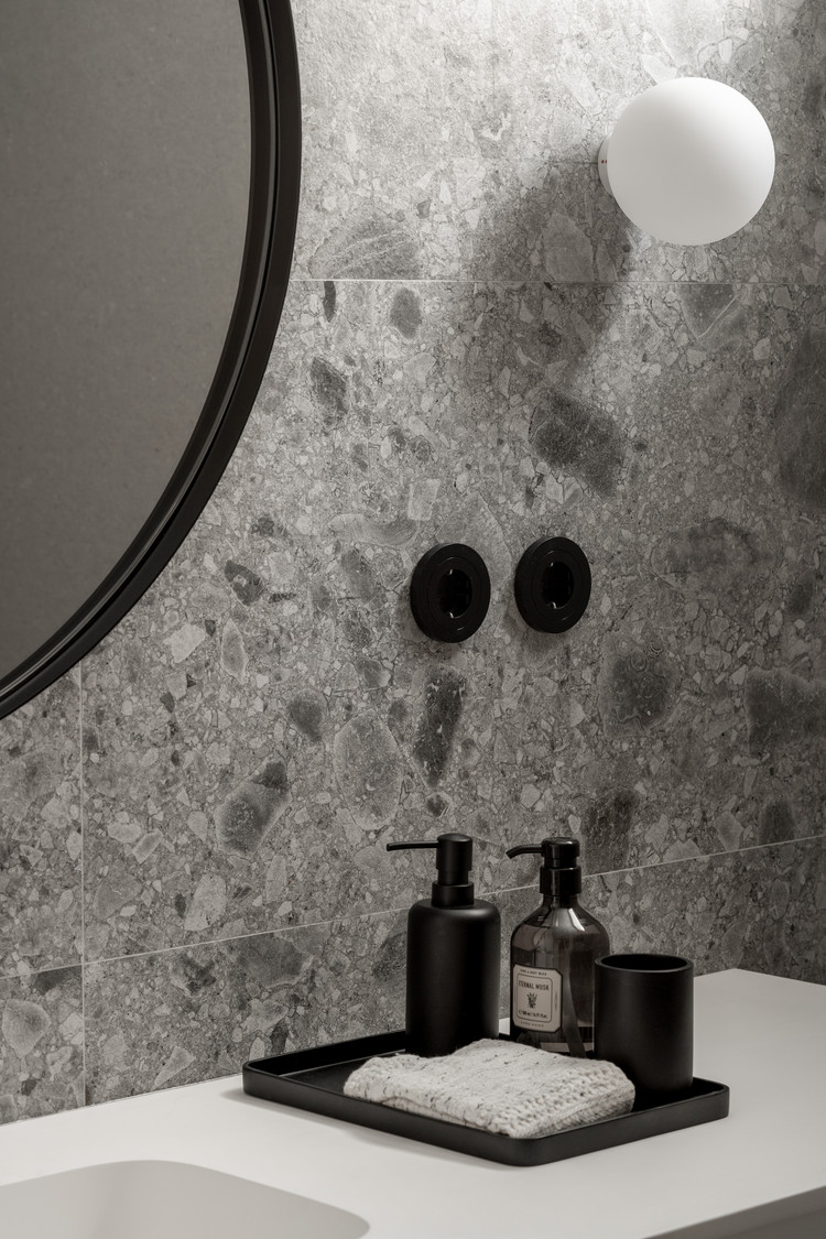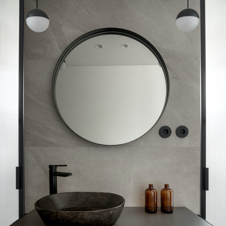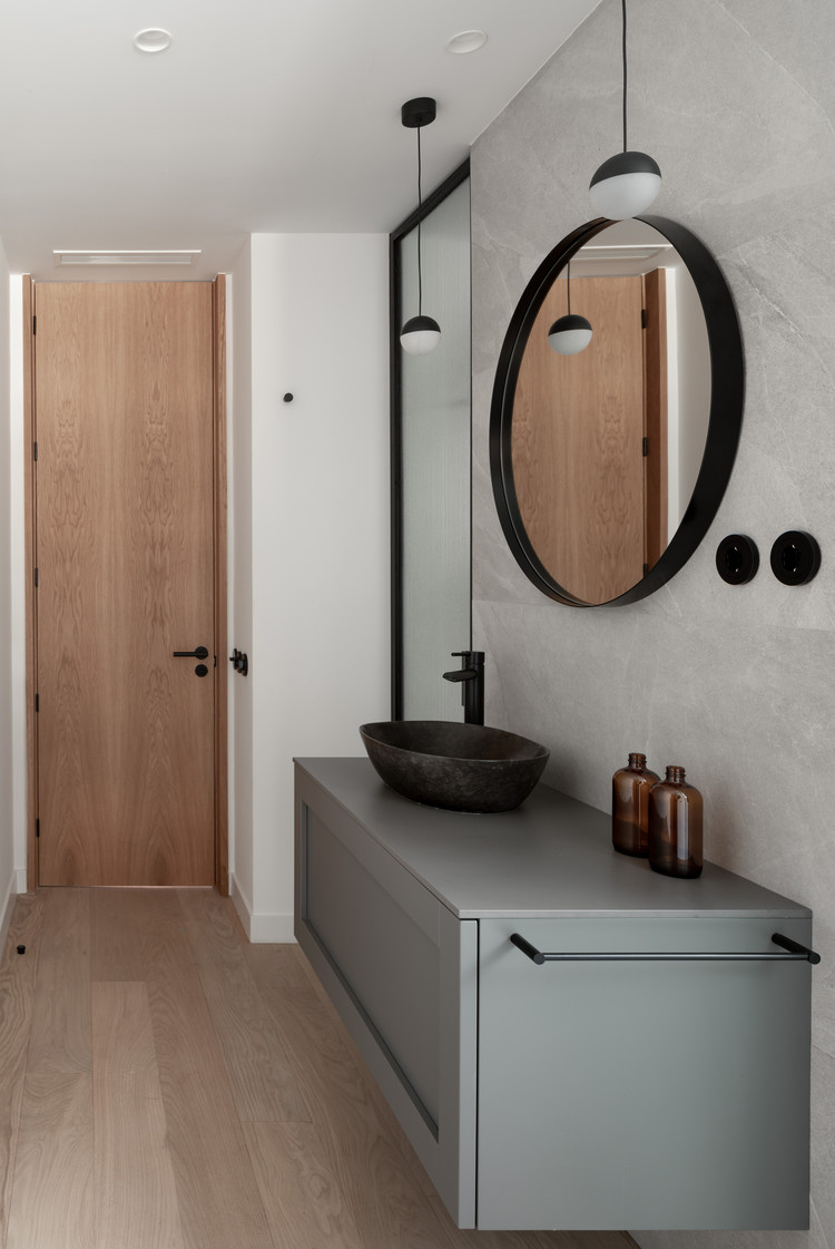 Seguimos hacia espacios más íntimos como el cuarto de baño principal. Este se plantea como dos espacios y uno intermedio, con el lavabo, situado en paso hacia el vestidor y la habitación. Aquí, la elección de materiales es más personal, casi caprichosa. Continúan, sin embargo, los signos de identidad del resto de la casa, puertas de roble natural de suelo a techo, manillas negro mate y esos interruptores tan característicos. La ducha es un espacio separado, totalmente revestido en cerámica oscura con vetas luminosas, creando un efecto de cueva iluminada y ventilada por un pequeño hueco en lo alto, todo en sintonía con la atmósfera de ritual y relajación que se busca para este espacio.