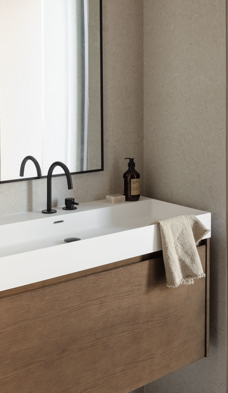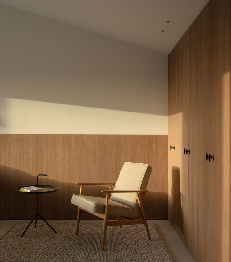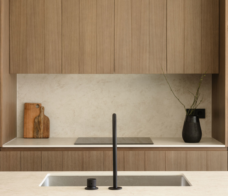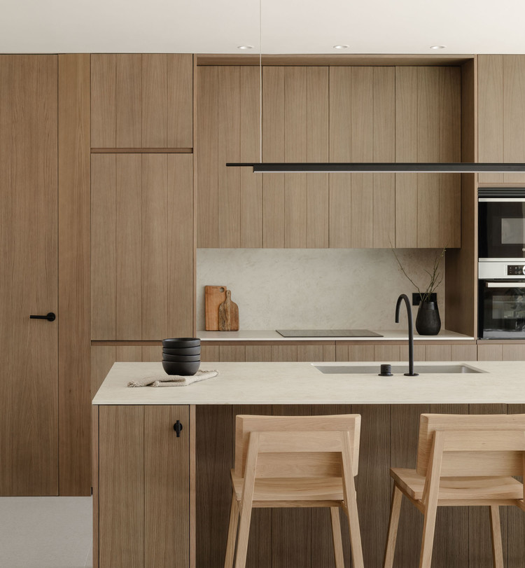 La cocina de madera de roble tintada es diseño de Polo Estudio y realizada por un fabricante local. Las dos puertas en los laterales de la cocina dan acceso a la zona de lavadero y a una pequeña despensa respectivamente. En la isla de la cocina, taburetes de roble macizo de Nathan Yong para Etnicraft. Sobre la isla, lámpara lineal suspendida Coln de AC studio.