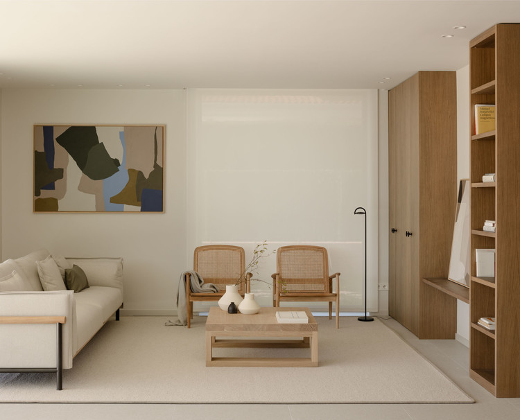En la zona de salón destaca el sofá diseño de Mario Ruiz para Joquer en Galea Home. En el centro del espacio, mesa de centro de madera de roble de la colección Vincent Van Duysen para Zara Home y lámpara de pie de la firma danesa Hay.