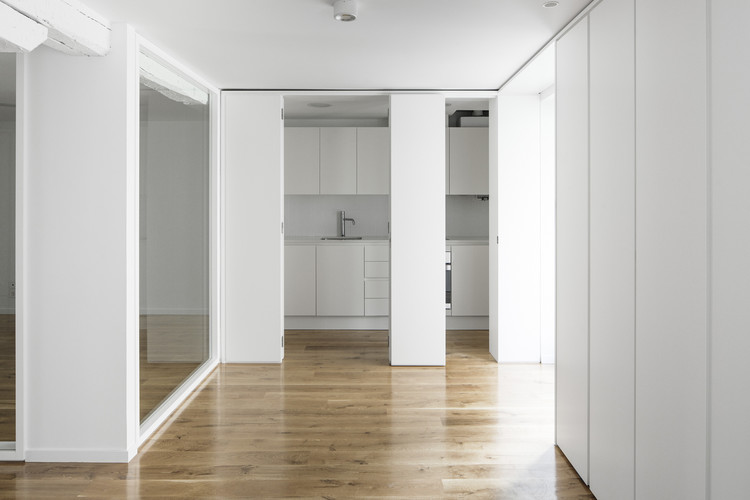 La primera planta responde a un programa flexible, que puede ser usado tanto como lugar de reuniones, y despacho, o como apartamento de dos habitaciones. A lo largo de la fachada trasera se dispone una segunda piel interior de mobiliario. La modulación de esta larga pieza de mobiliario se adapta a la posición desordenada de las ventanas enfatizando con embocaduras blancas el grosor del propio muro. El mobiliario realiza una función ordenadora del espacio generando ritmos verticales y escala. Todos los muebles marcan una cota horizontal por debajo de las vigas principales habilitando así, su función de distribución interior al generar el acceso semi-privado a la zona de lavabo. Este mismo volumen de mobiliario se dobla para formar el acceso a la cocina permitiendo independizarla o conectarla con el espacio del comedor, según se desee.