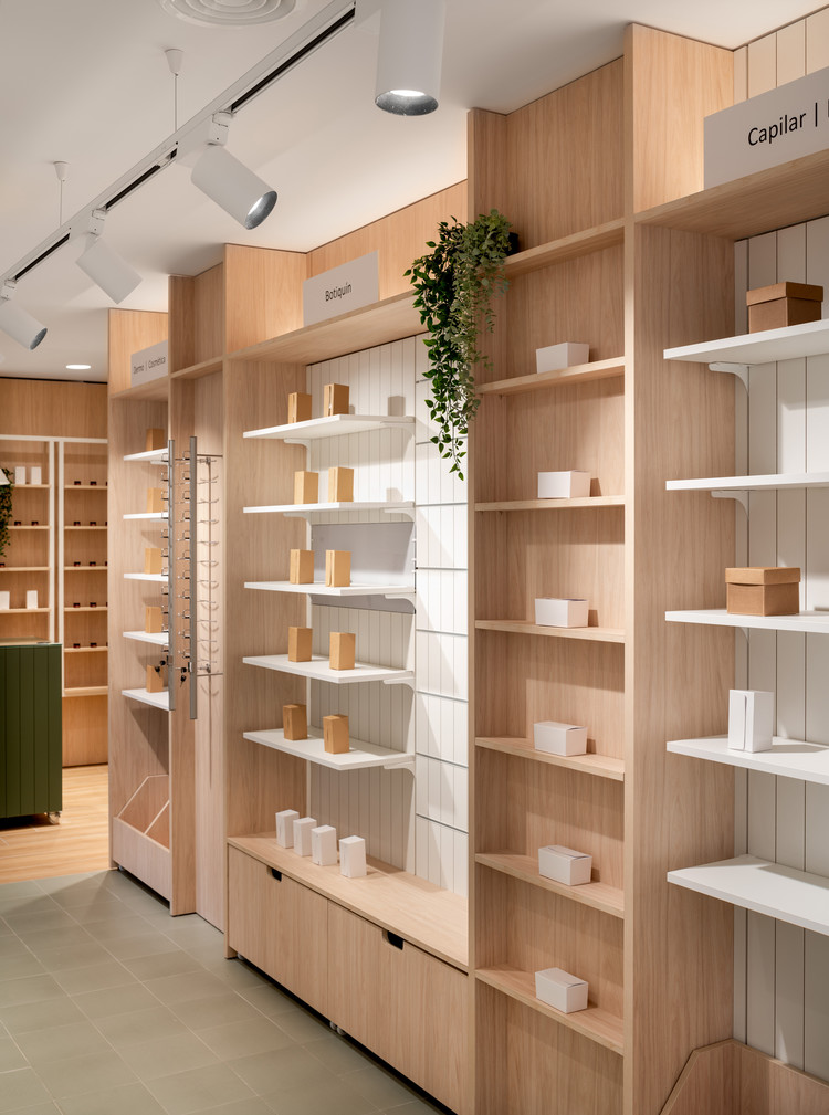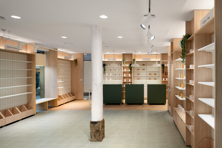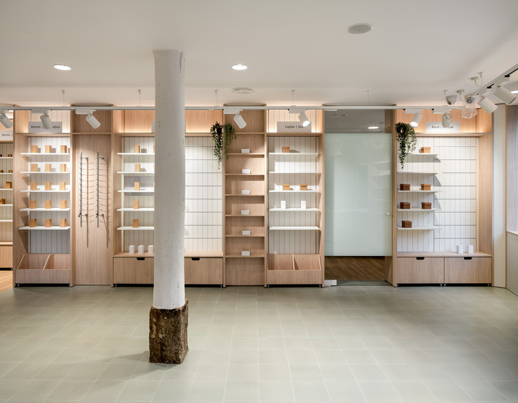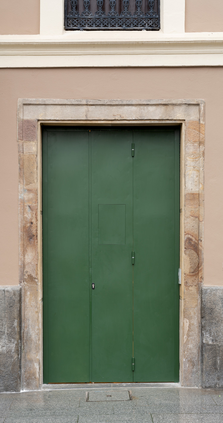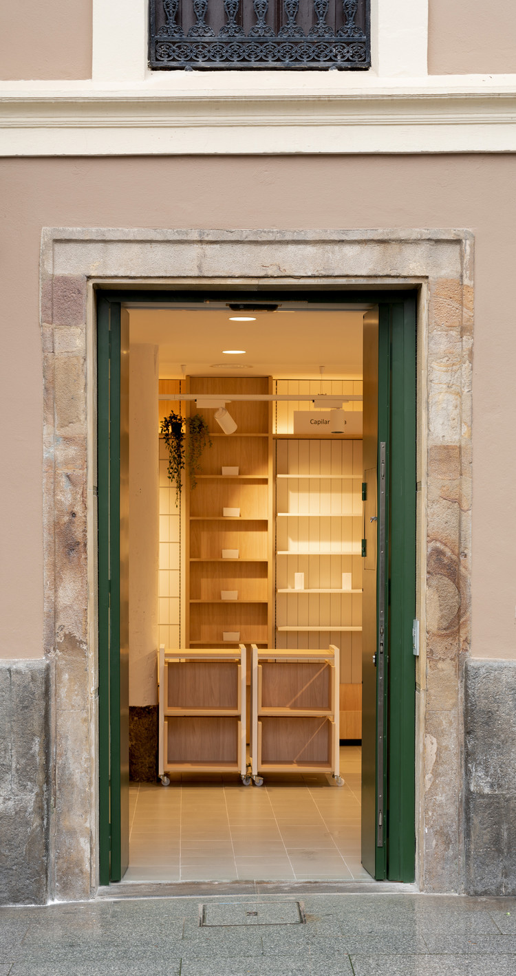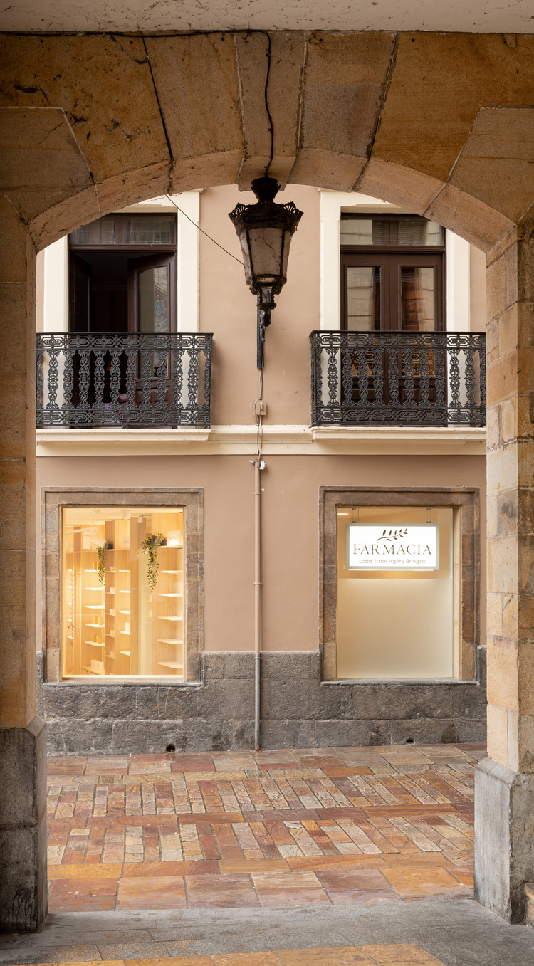 El acceso principal a la farmacia se resuelve con una gran puerta cancela, totalmente ciega cuando está cerrada, excepto por la ventanilla de guardias. Se restauran los marcos de piedra originales, una piedra porosa con una riqueza de tonalidades, con la expresividad propia de un material auténtico y natural. Al igual que otros detalles de mobiliario interior, en la carpintería de fachada se rescatan los colores originales de los detalles de carpintería del edificio.