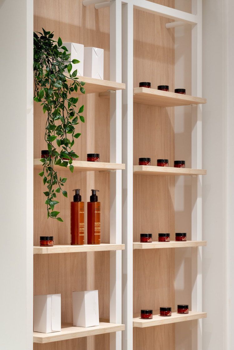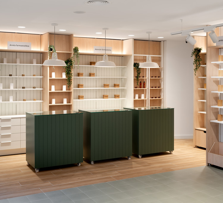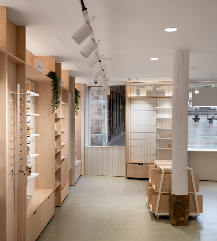 Los mostradores destacan con textura de entablado y se presentan como piezas móviles y adaptables, además de aportar notas de color que dialogan con el verde de la fachada original del edificio. Un verde alegre y vibrante que es típico de las ventanas y contraventanas del País Vasco y País Vasco Francés.