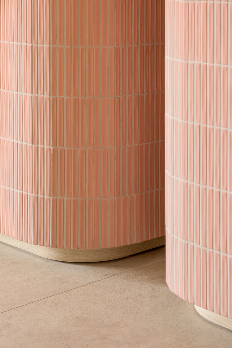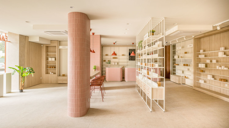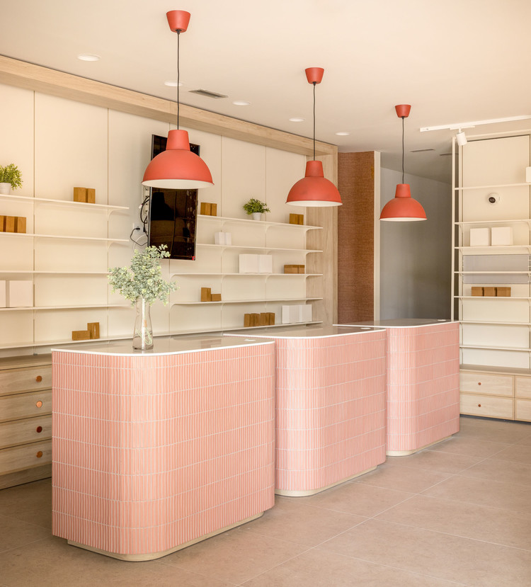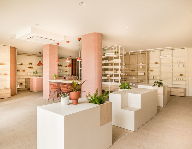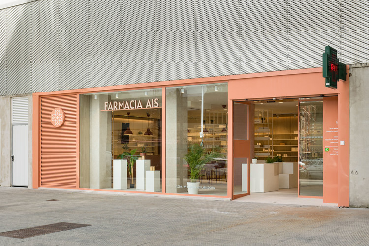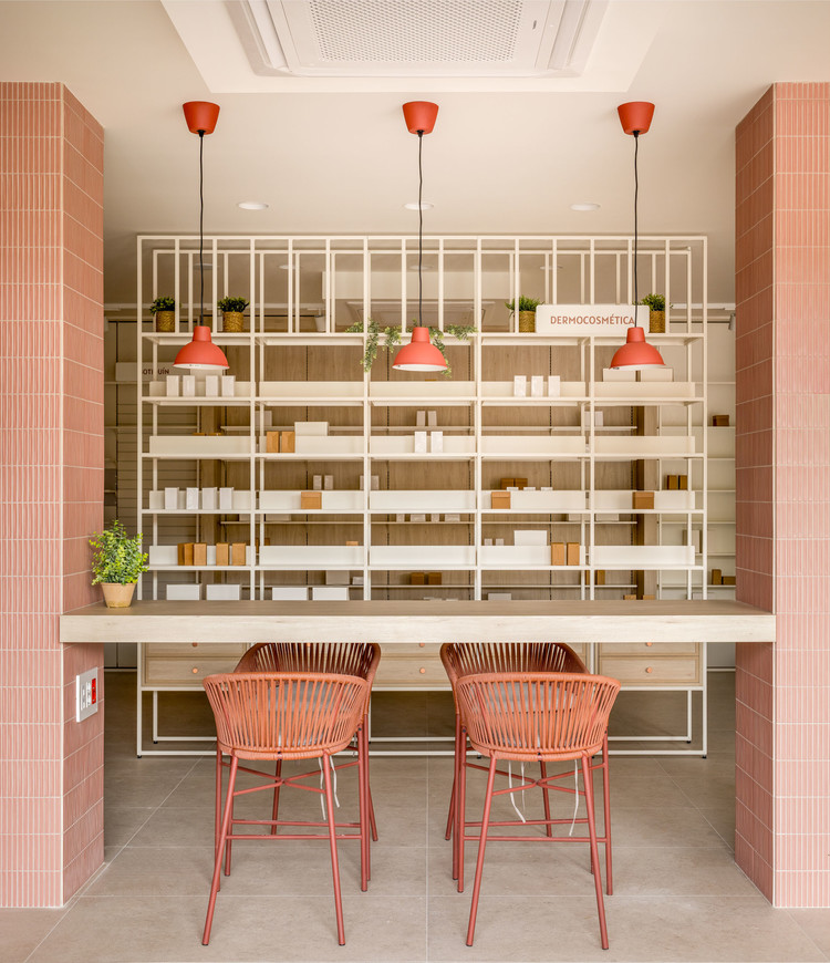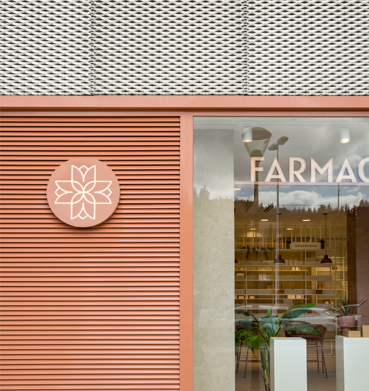 La farmacia se sitúa en un local amplio y nuevo, con la marcada presencia de una malla metálica en la fachada. Frente al carácter duro de esta, se propone una fachada que se amabiliza y toma escala mediante el uso del color. En el interior, se continúa esta decisión de diseño, que se complementa con detalles de madera en tonos claros, mobiliario blanco y pavimento de gran formato. El acento lo aportan las luminarias sobre mostradores en un tono más ácido en textura mate, empolvada. Las formas del mobiliario y columnas se suavizan para favorecer la circulación y fluidez de espacios.