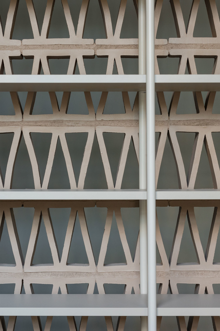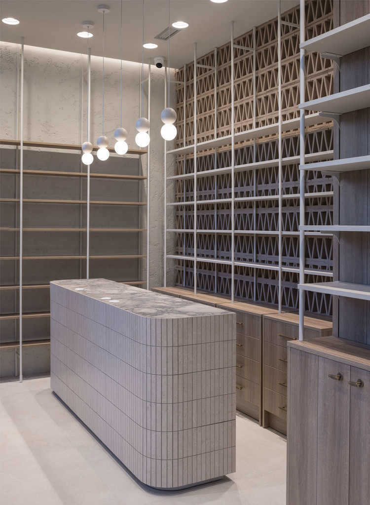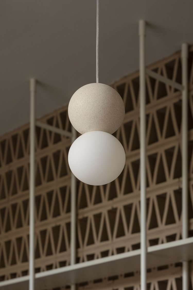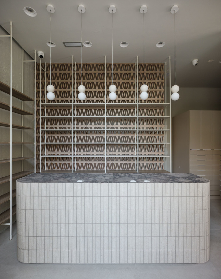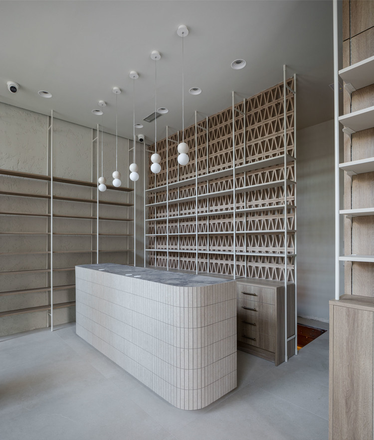 Una celosía cerámica compuesta de piezas de diseño en las que triángulos consiguen, mediante la repetición, una celosía con un dinámico juego de diagonales entrecruzadas. Este elemento separa los mostradores de la escalera hacia el piso inferior, permitiendo que la escalera tenga luz natural. Los mostradores tienen una geometría curva que invita a hacer el giro desde el acceso a la zona de atención y se resuelven mediante piezas cerámicas cortadas a medida. Sobre estos, la sutil iluminación cobra protagonismo, mediante pares de esferas opal y mate suspendidas.