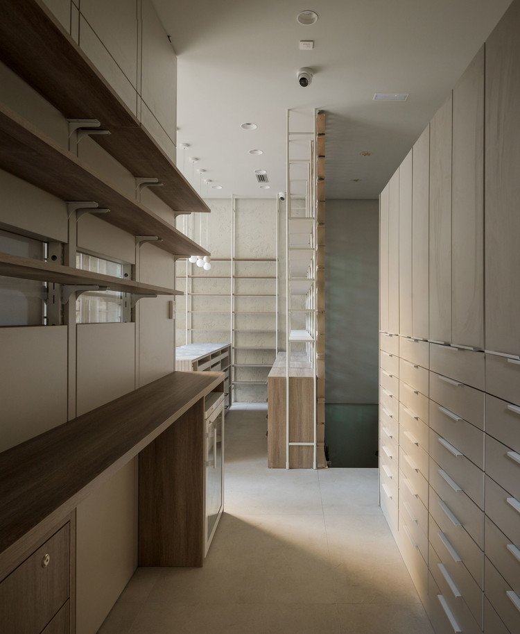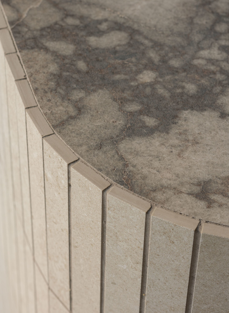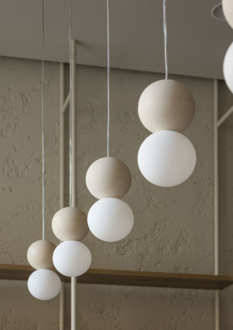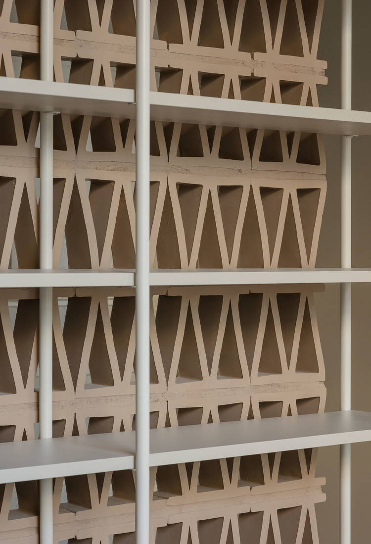 Una celosía cerámica compuesta de piezas de diseño en las que triángulos consiguen, mediante la repetición, una celosía con un dinámico juego de diagonales entrecruzadas. Este elemento separa los mostradores de la escalera hacia el piso inferior, permitiendo que la escalera tenga luz natural. Los mostradores tienen una geometría curva que invita a hacer el giro desde el acceso a la zona de atención y se resuelven mediante piezas cerámicas cortadas a medida. Sobre estos, la sutil iluminación cobra protagonismo, mediante pares de esferas opal y mate suspendidas.