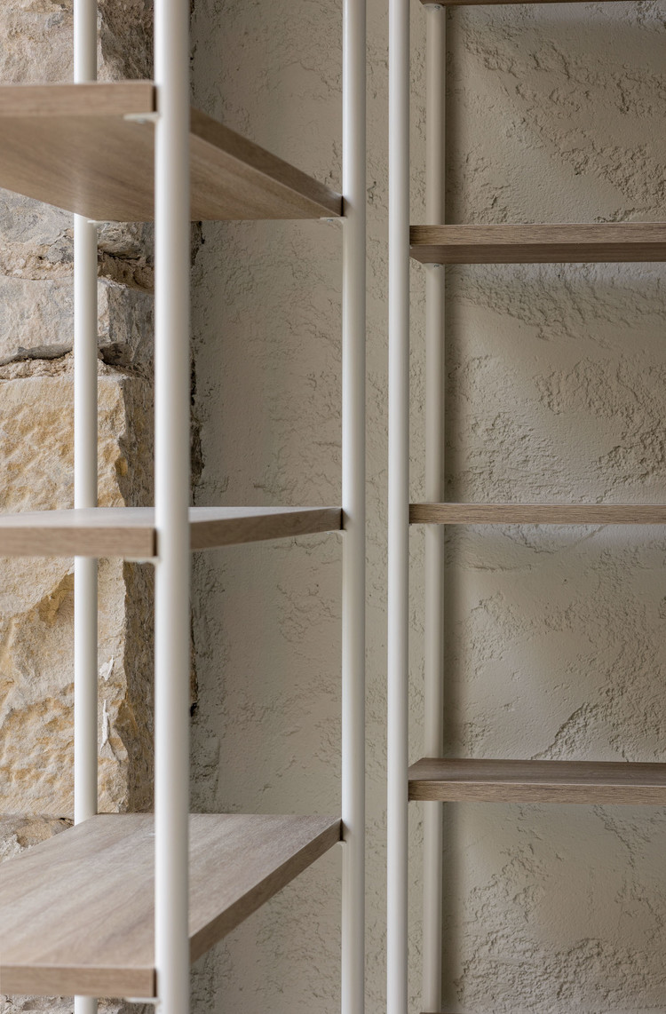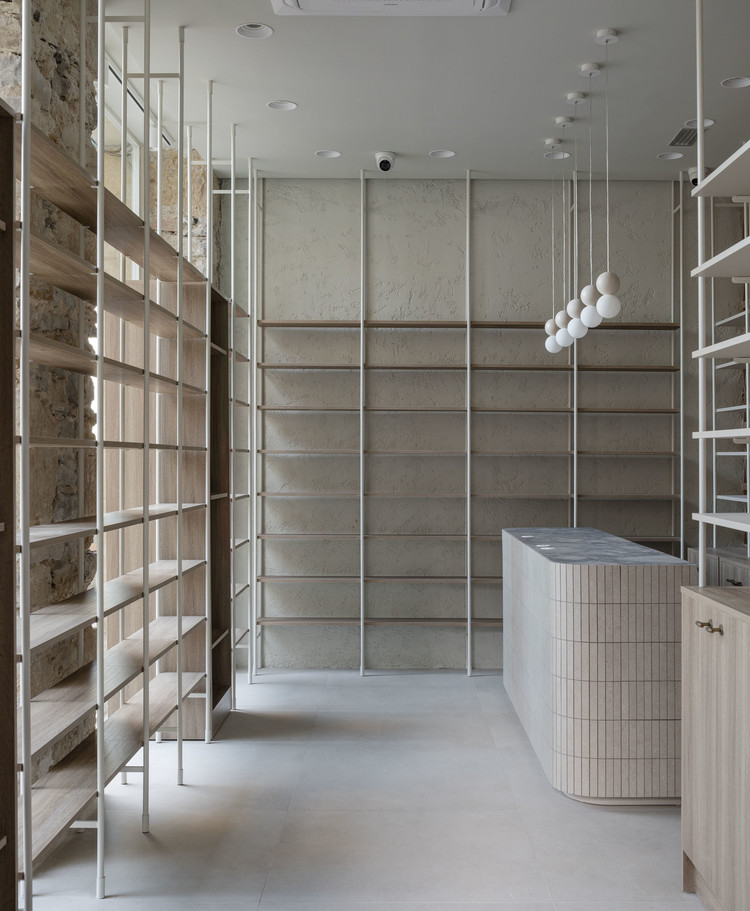 El resto de elementos que componen el espacio interior completan la paleta natural. El único muro que no es de piedra se reviste con un acabado de mortero de cal artesanal. El resto del mobiliario que resuelve la exposición de producto de farmacia se realiza en madera de roble en tono tostado. Para la iluminación técnica se ha optado por una iluminación del fabricante austiaco Prolicht, empotrada en los techos de la zona de público.