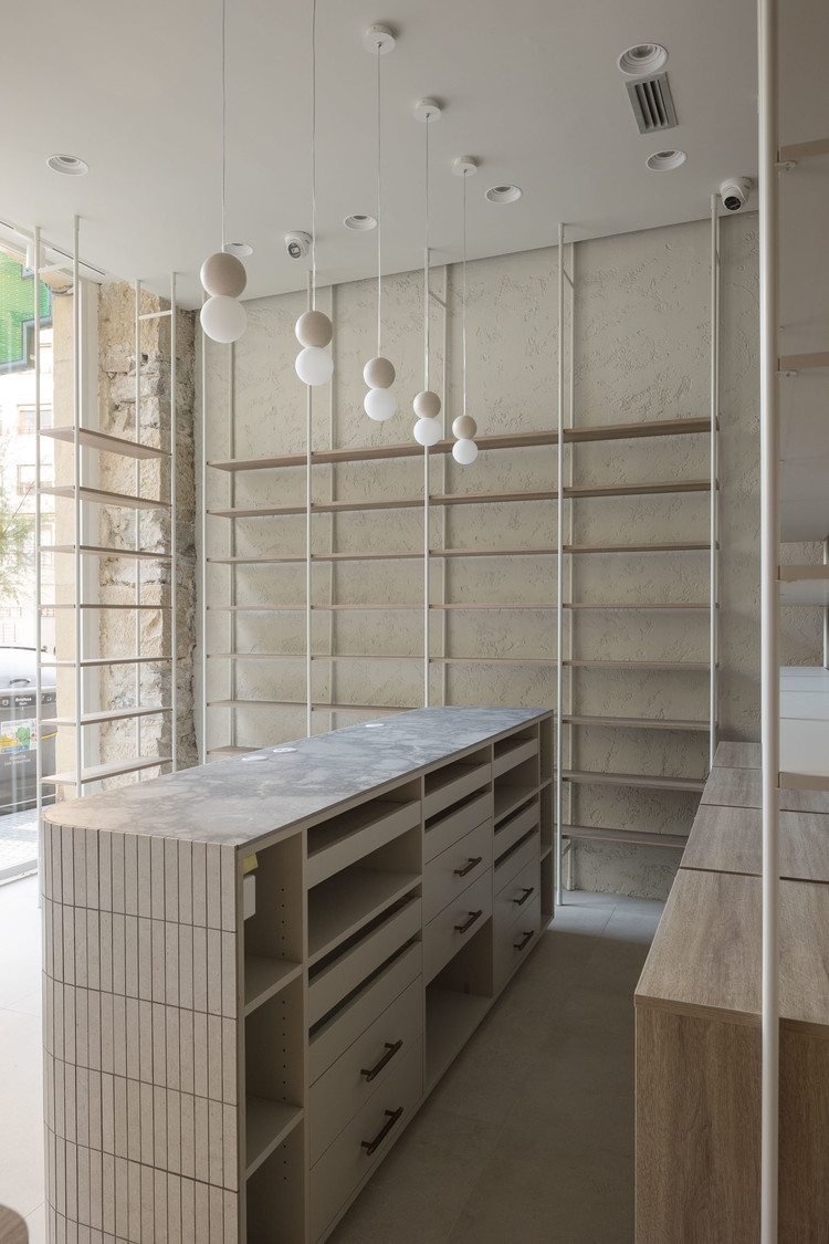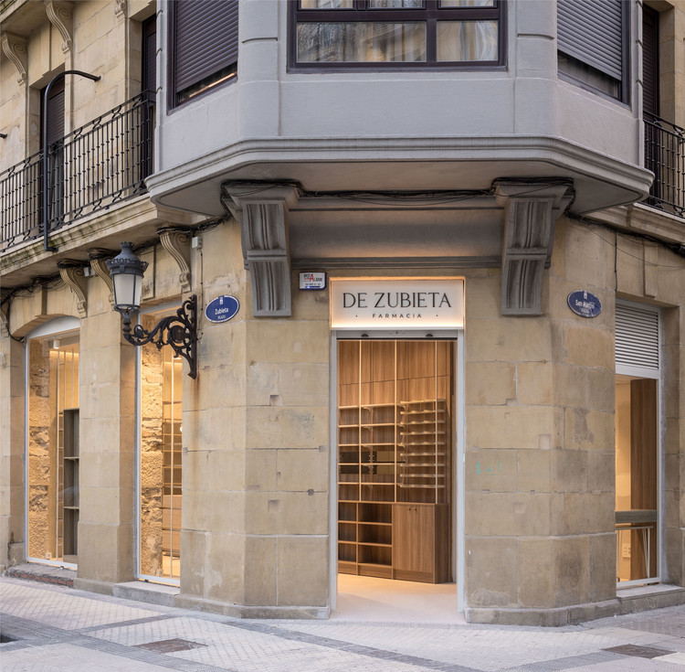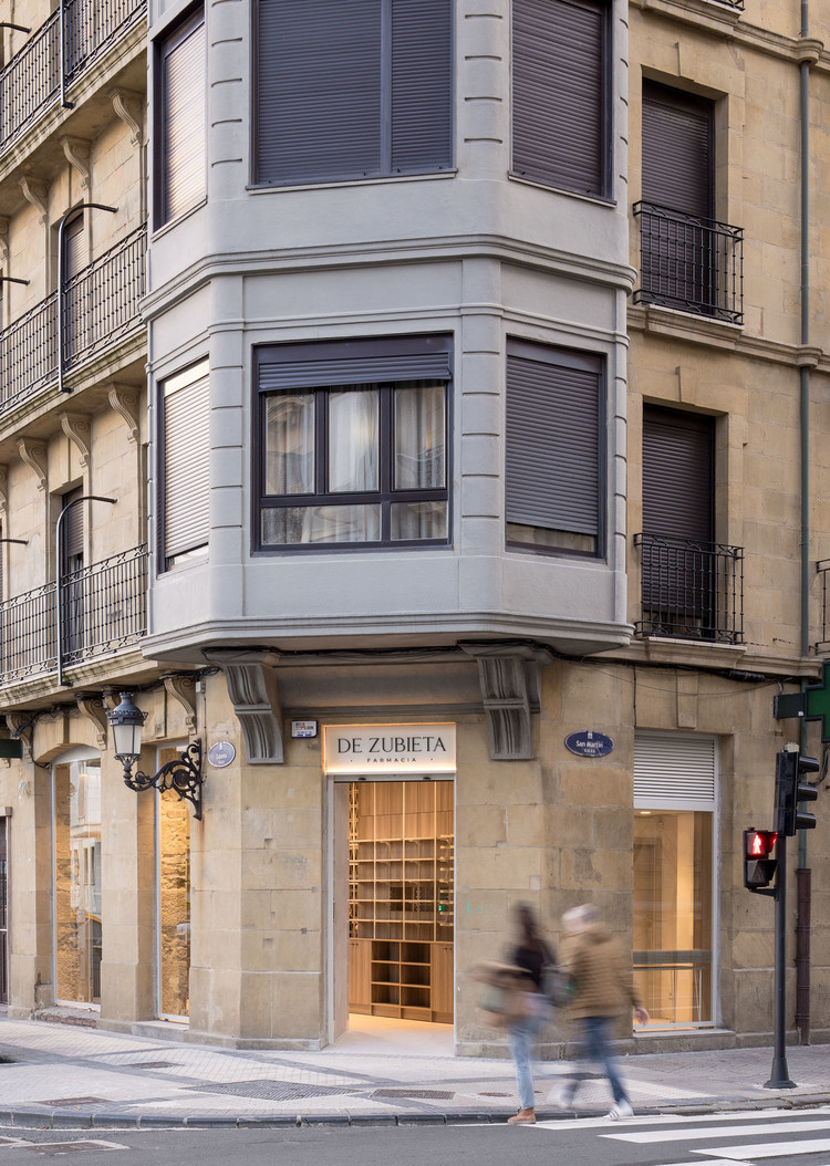 En San Sebastián, a pocos metros del paseo de la Concha la calle San Martín se cruza con la calle de Zubieta dando lugar a una pequeña e histórica plaza. En uno de los edificios de fachada de piedra que dan a la plaza, se ubica la farmacia de Zubieta. El local es ligeramente estrecho y longitudinal, bañado por la luz a través de los grandes ventanales hacia la Plaza de Zubieta. El proyecto juega con una paleta de materiales naturales, entre ellos la piedra de los muros de fachada originales. Esta piedra se pone en valor con el uso de un mobiliario muy ligero que favorece la transparencia con el exterior.