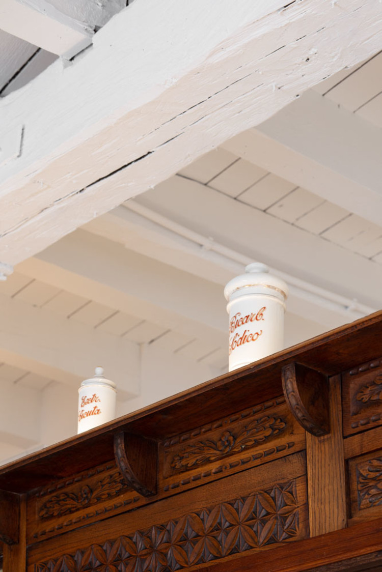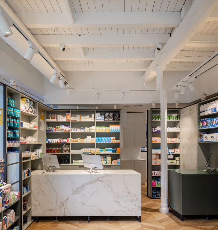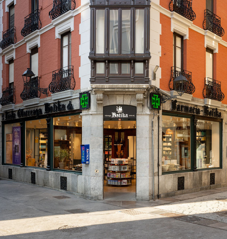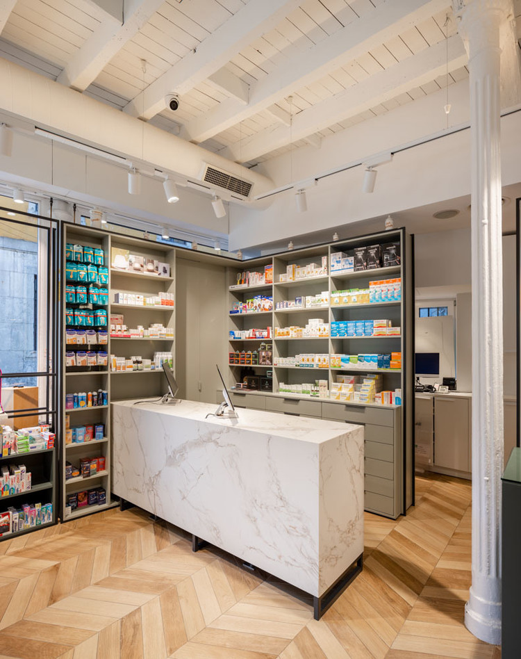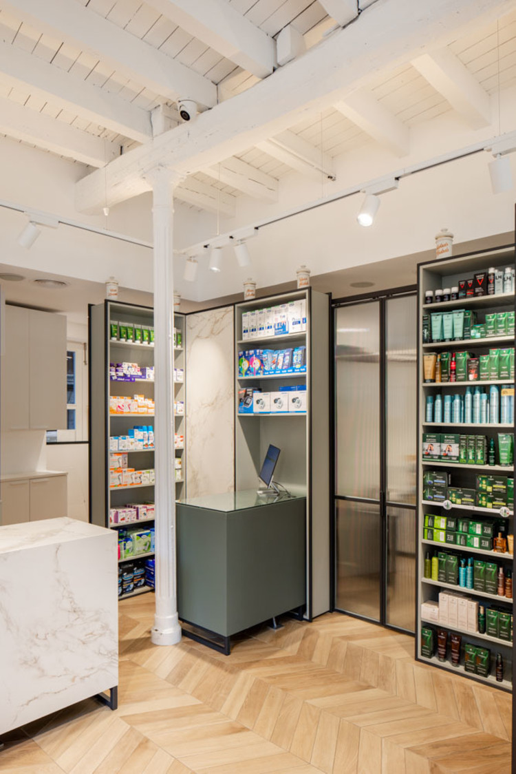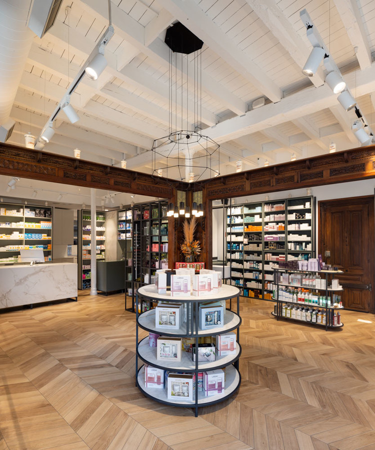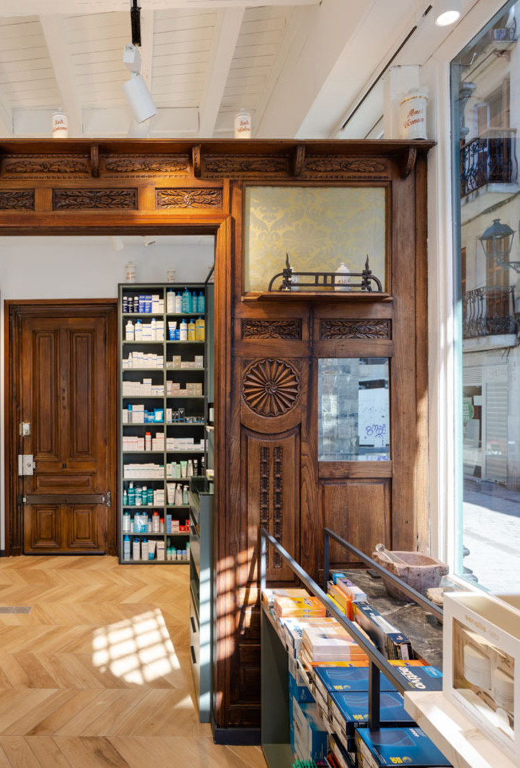 En el proyecto se incorporan y restauran los elementos históricos de la farmacia, desde el mobiliario, a las puertas, también la sillería de fachada y la estructura de forjados de madera. Además, se amplía la altura del sótano, mediante una excavación extremadamente delicada. Esto se hace así porque además de la zona de atención al público, la farmacia apuesta por otros espacios que se sitúan bajo la misma: una sala de formación y eventos, el laboratorio farmacéutico y despacho.