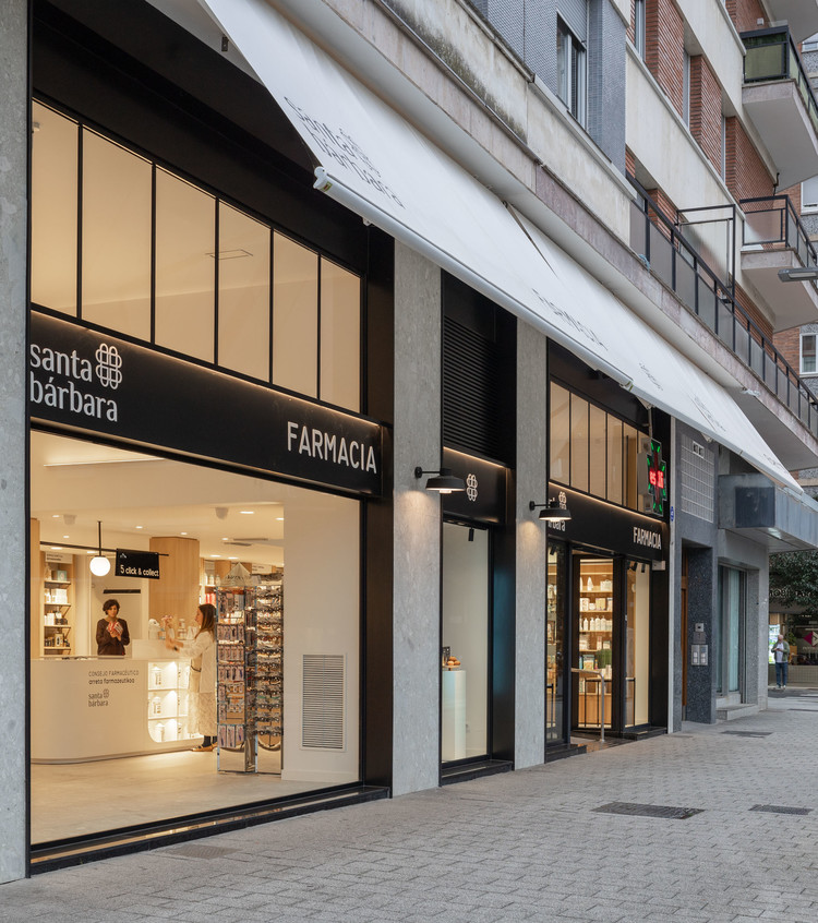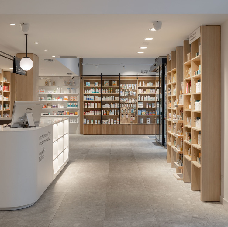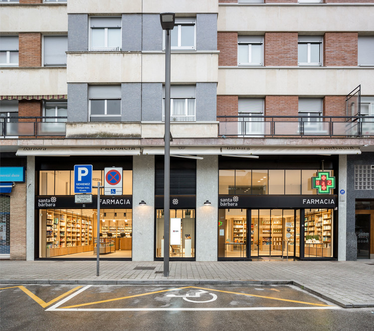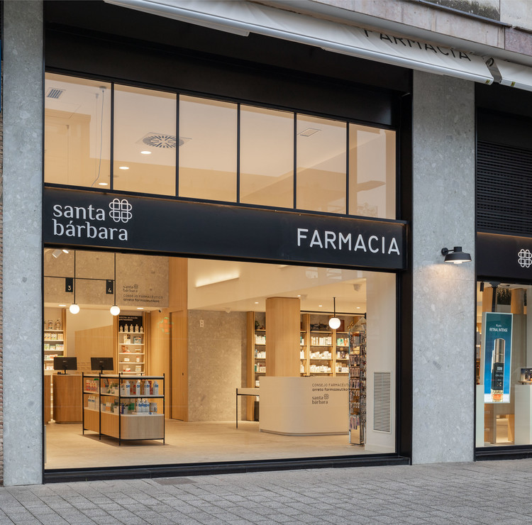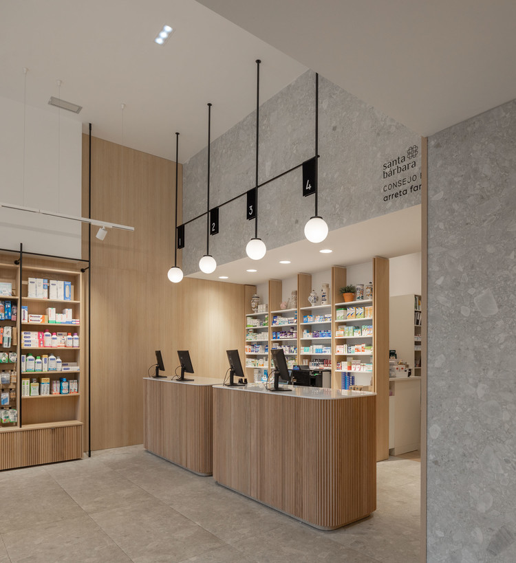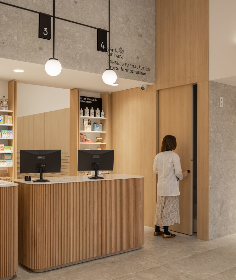 Una de las claves del diseño de la farmacia en plaza Santa Bárbara de Vitoria es su transparencia hacia el espacio público. Tradicional mercado de productores locales y recientemente renovada, la plaza es un lugar de encuentro y un pulmón para el barrio en el que se ubica. El local de farmacia cuenta con techos altos, que permiten la creación de zonas de distintas alturas, jugando con la luz y el aprovechamiento de la entreplanta. Los materiales empleados buscan destacar esta geometría,con texturas de piedra sedimentaria y detalles de listones de madera. Además, se crean lugares singulares a través de la iluminación artificial, que señala la zona de mostradores y un nuevo espacio de recogida de encargos.