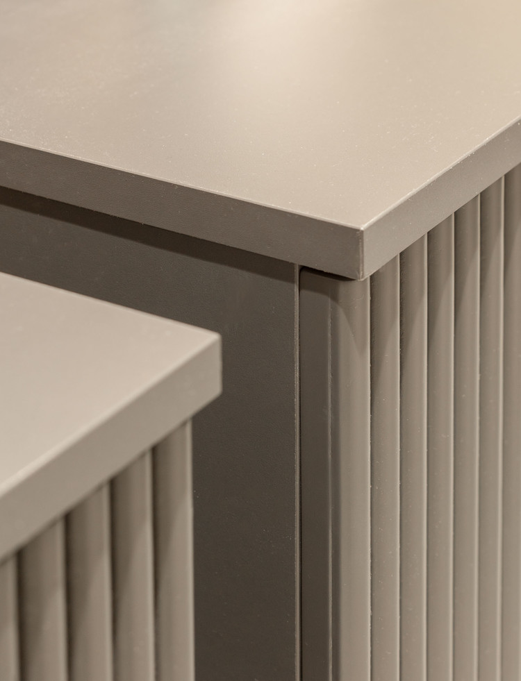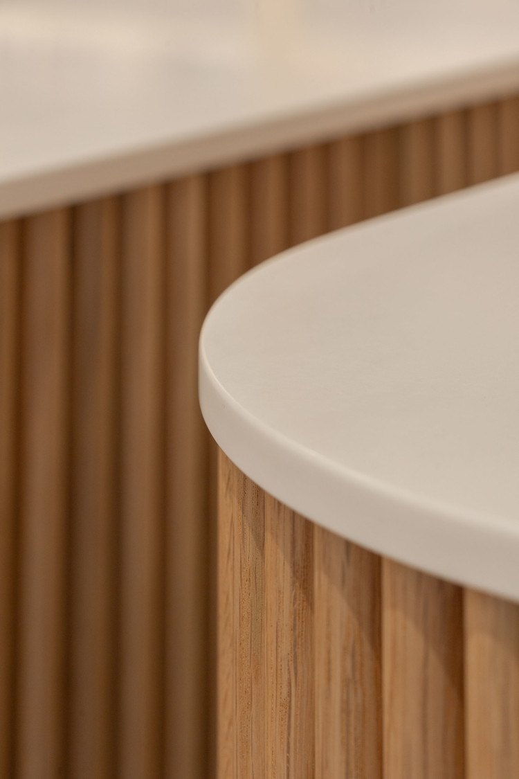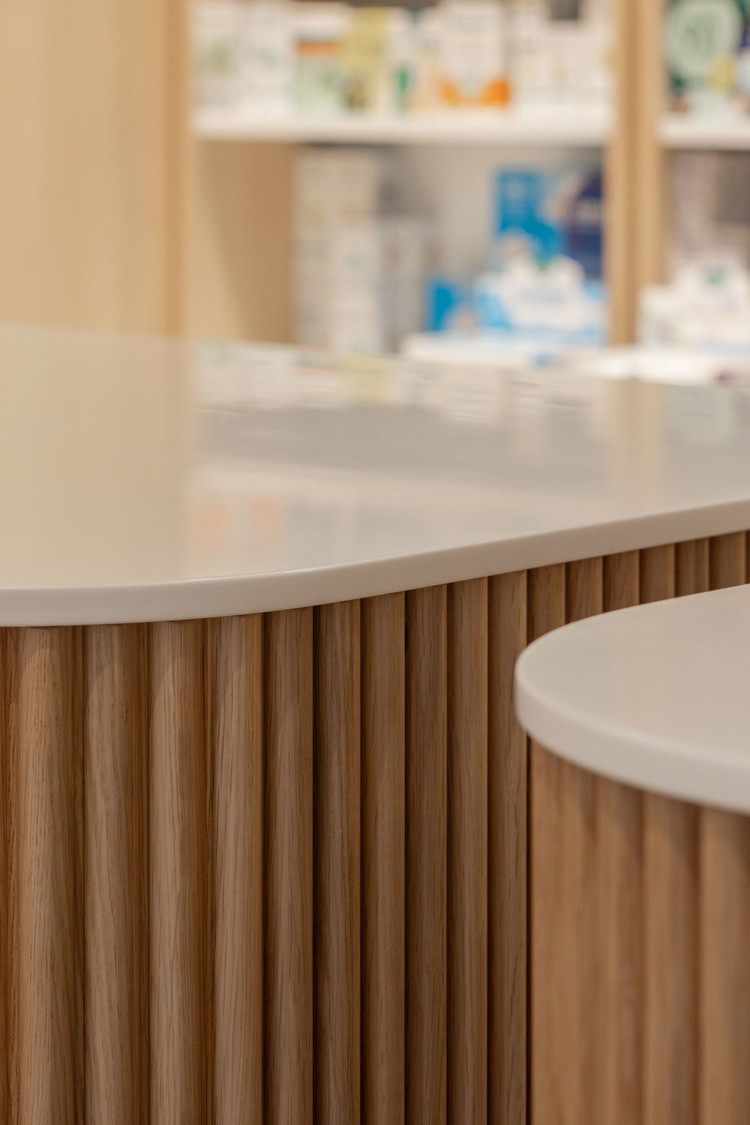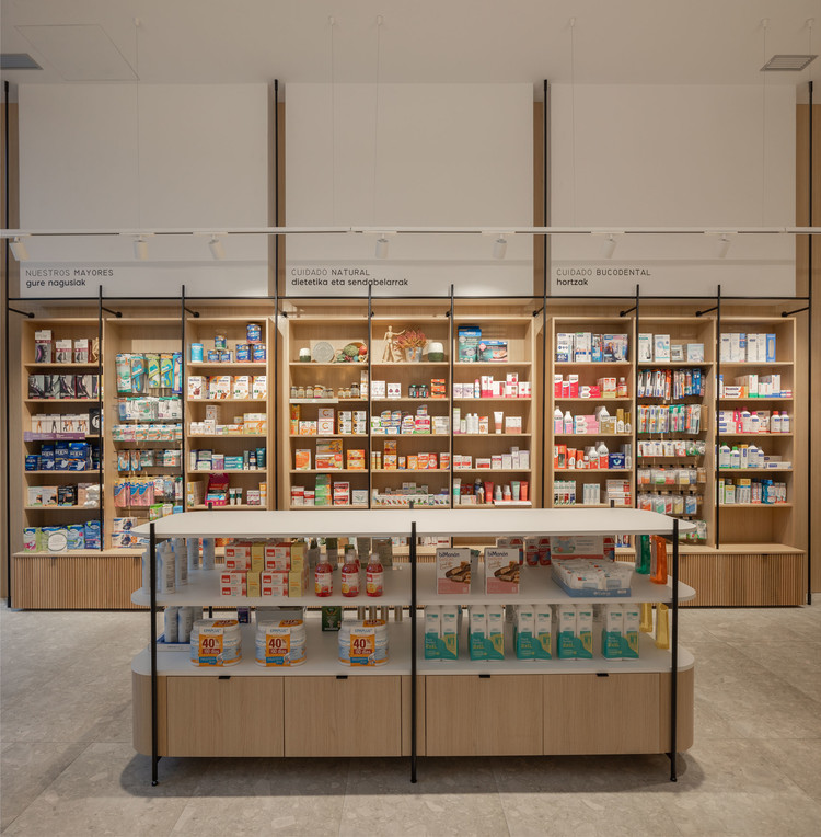 Una de las claves del diseño de la farmacia en plaza Santa Bárbara de Vitoria es su transparencia hacia el espacio público. Tradicional mercado de productores locales y recientemente renovada, la plaza es un lugar de encuentro y un pulmón para el barrio en el que se ubica. El local de farmacia cuenta con techos altos, que permiten la creación de zonas de distintas alturas, jugando con la luz y el aprovechamiento de la entreplanta. Los materiales empleados buscan destacar esta geometría,con texturas de piedra sedimentaria y detalles de listones de madera. Además, se crean lugares singulares a través de la iluminación artificial, que señala la zona de mostradores y un nuevo espacio de recogida de encargos.