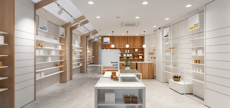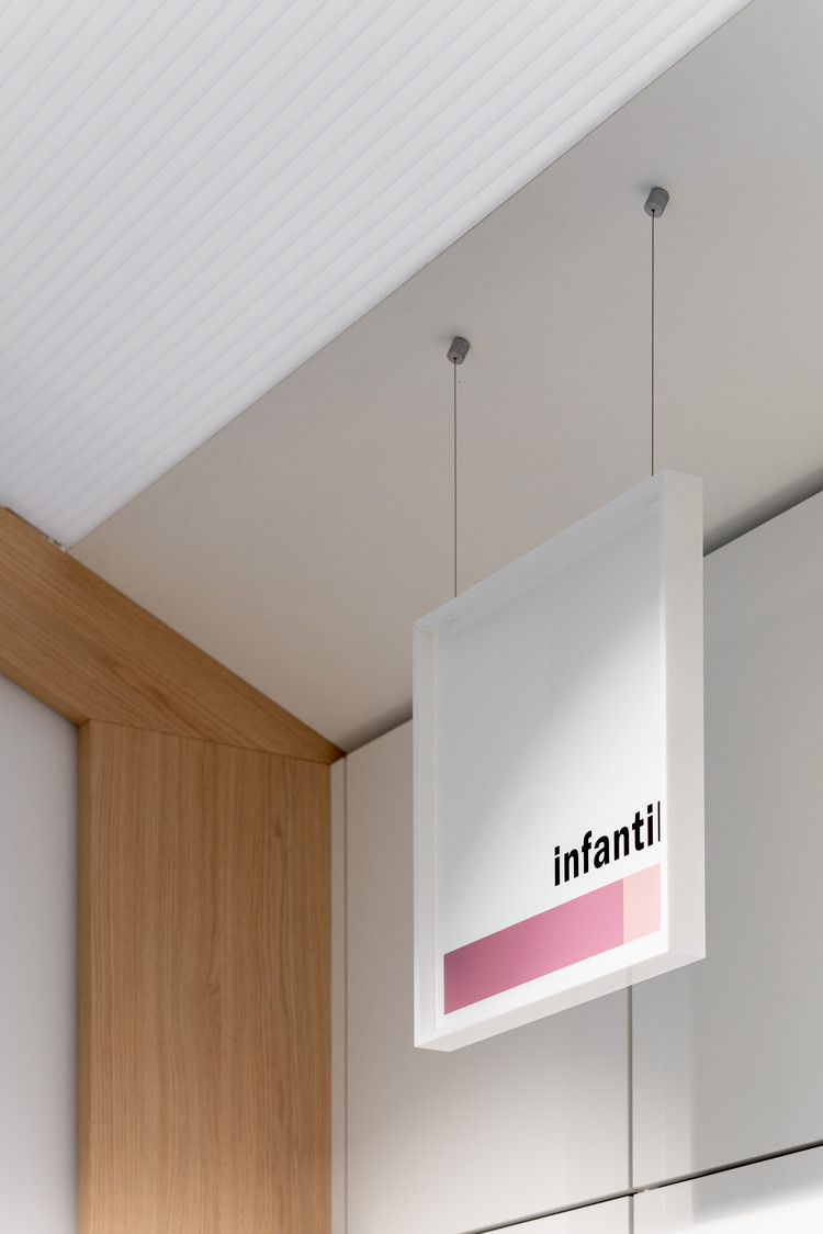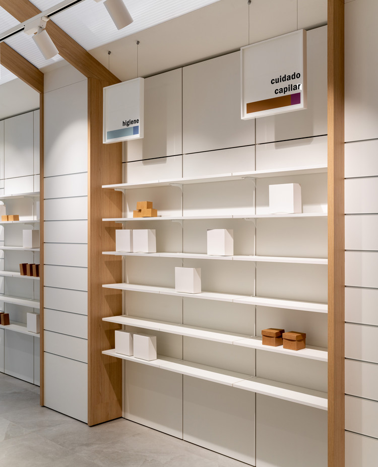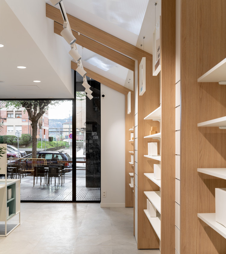 La volumetría del local invita a crear un plano elevado de luz cenital que recorre el espacio desde la fachada principal a la fachada posterior del edificio, creando una continuidad en la iluminación. En el interior, paños monocromáticos blancos se encuentran con el paño de madera tras el mostrador y se acentúa este contraste con una textura de secciones semicirculares en la madera. Además, se emplean toques de color, que destacan los elementos menos permanentes como señalética y góndolas centrales.
