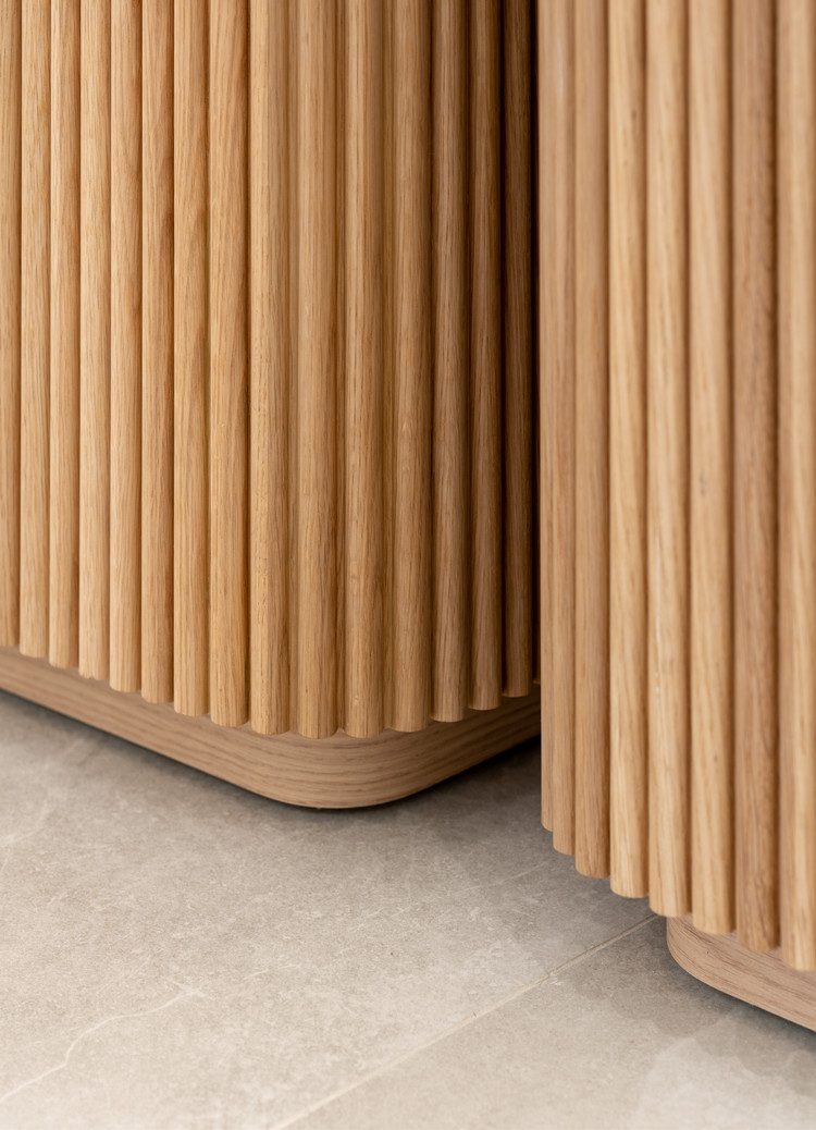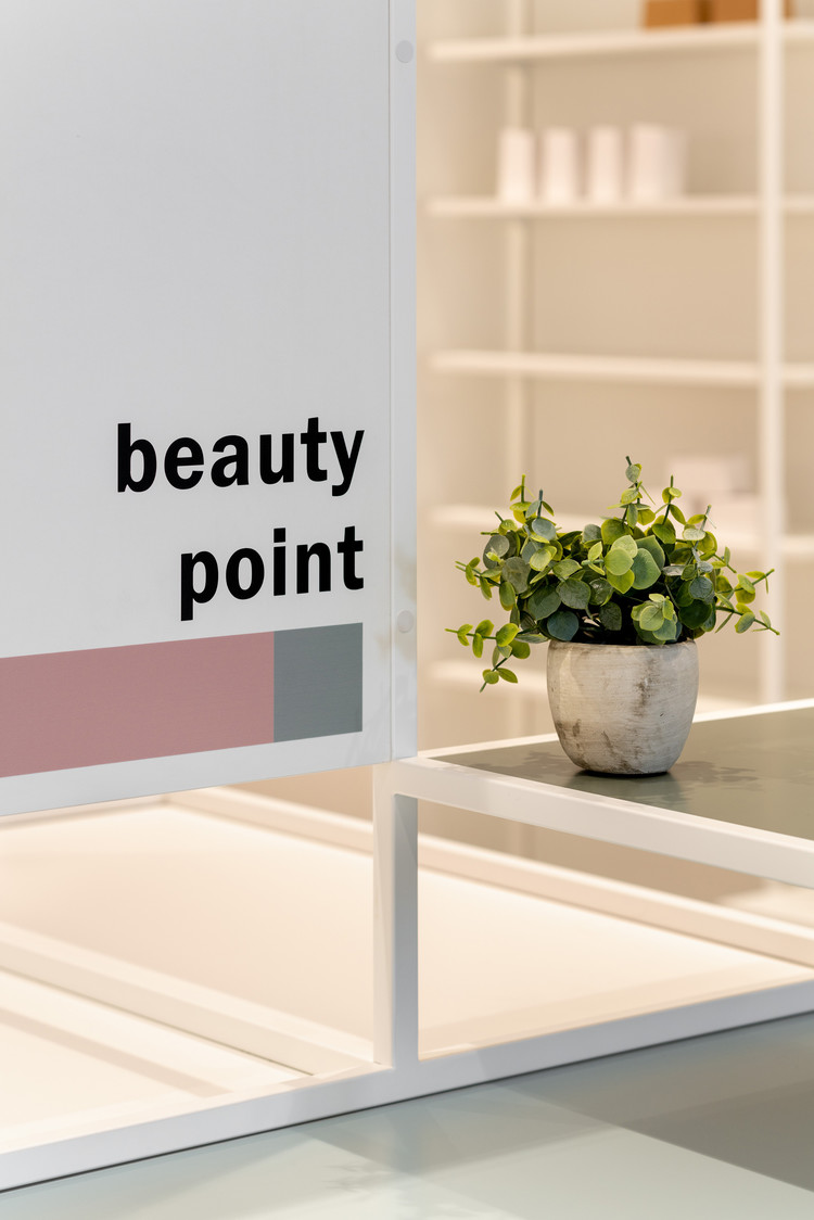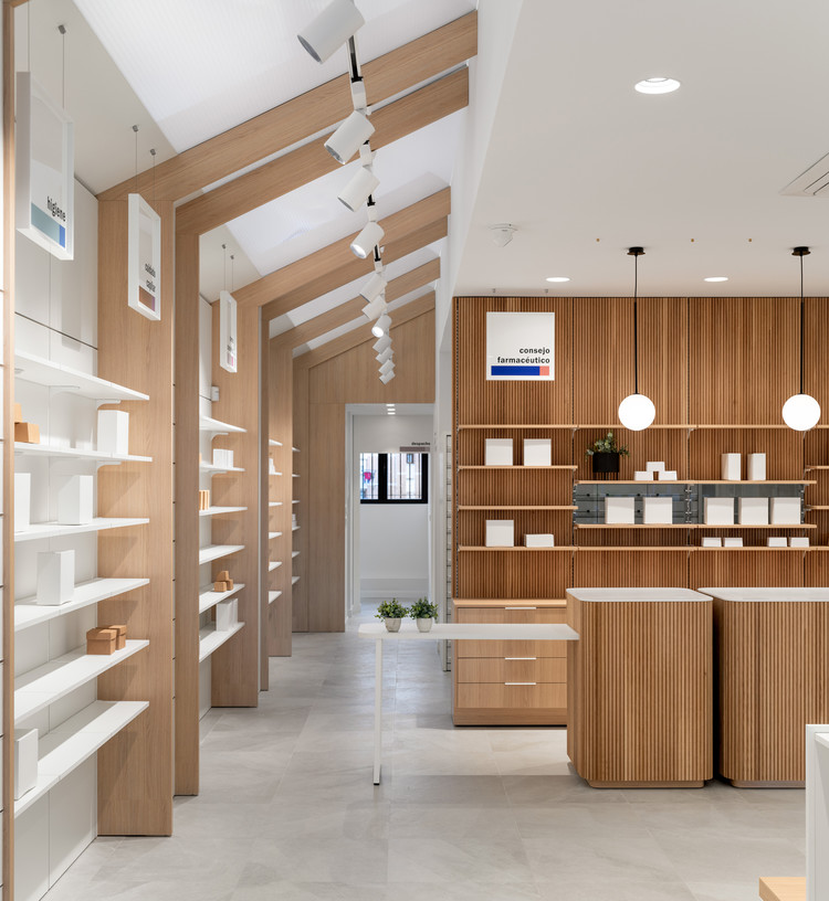 Los mostradores destacan como piezas exentas y artesanales, con una geometría especial y máximo cuidado del detalle. Se busca poner en valor y aportar herramientas para la atención presencial en la farmacia, con puntos clave como el beauty point.
