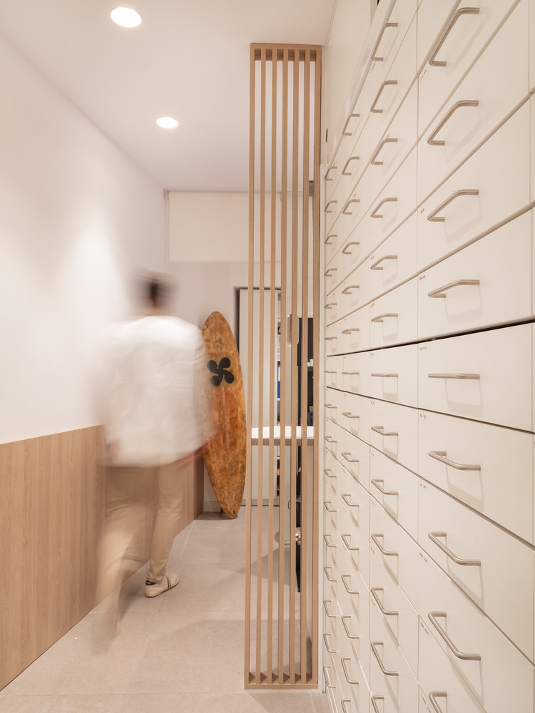 La zona de atención personalizada se amplía y se mejora su acceso desde el área de público. La iluminación juega un papel importante en esta farmacia, el producto se ilumina mediante proyectores de techo a la par que se aporta luz de ambiente desde el interior del mobiliario, mediante fuentes ocultas. Los colores verdes y texturas de madera de roble presentes en el proyecto, junto con la riqueza de la luz, consiguen mejorar la percepción del producto y la atmósfera del espacio de venta.