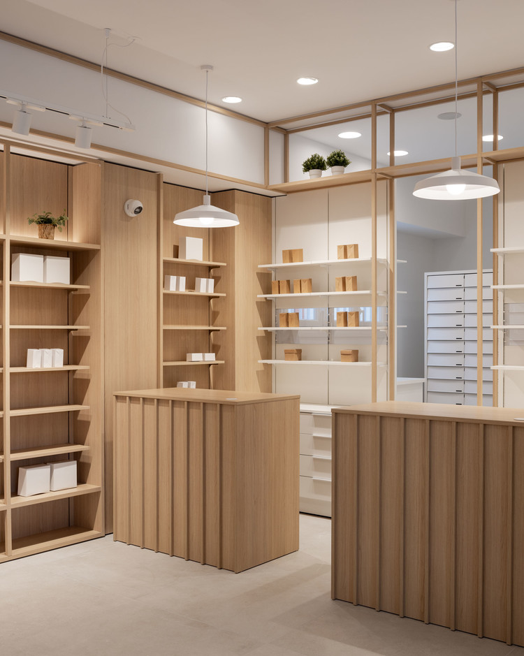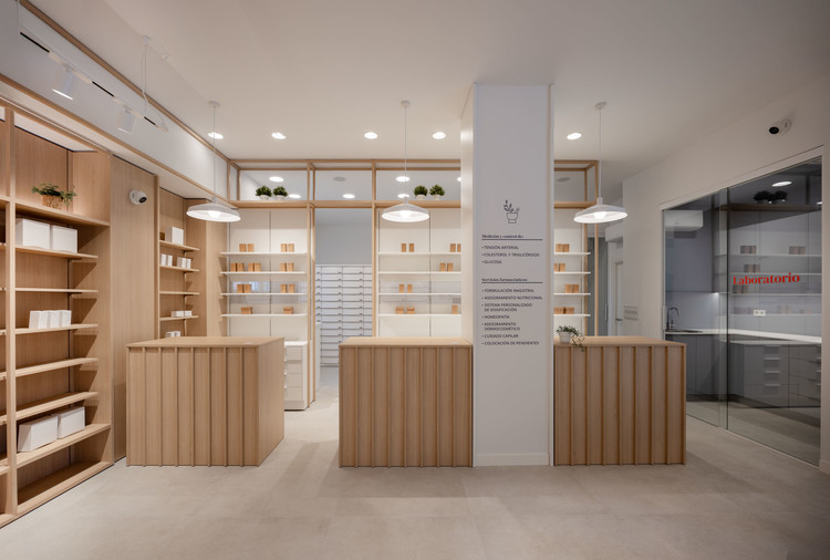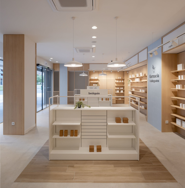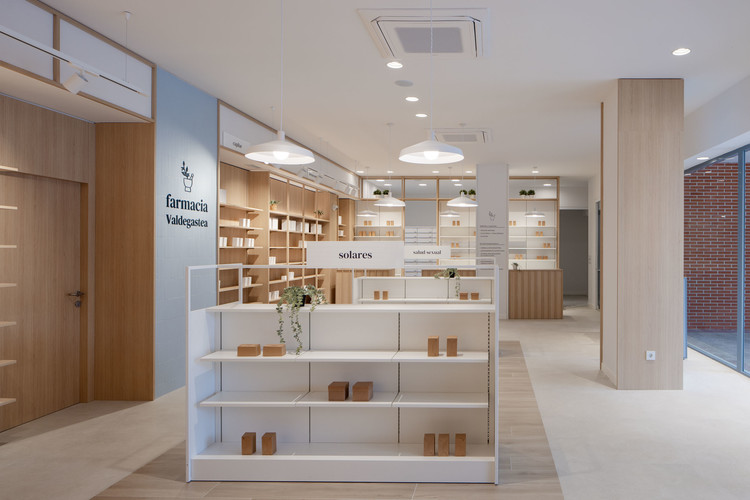 En el barrio Valdegastea, situado en el margen oeste de la capital riojana, la farmacia homónima se ubica en los soportales de un edificio de 8 alturas. En la farmacia, la cerámica esmaltada y la madera barnizada en tono claro conjugan un ambiente que busca seducir la luz hacia el interior a la par que poner en valor la zona cubierta y protegida de la intemperie que antecede al acceso. Hacia afuera, continuando el ritmo del ladrillo de fachada, se articula un sistema metálico para organizar tanto los escaparates como la entrada.