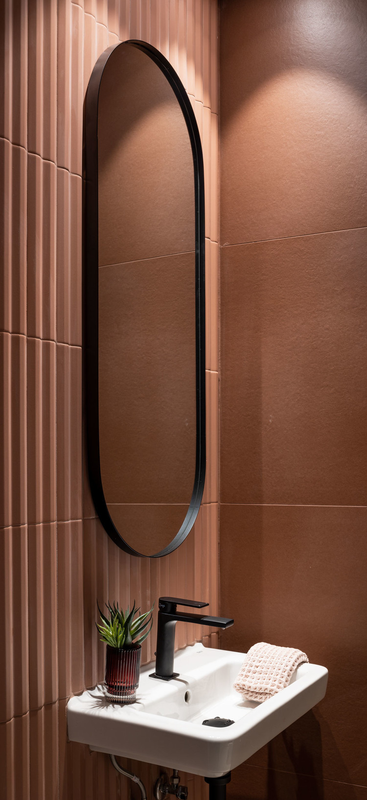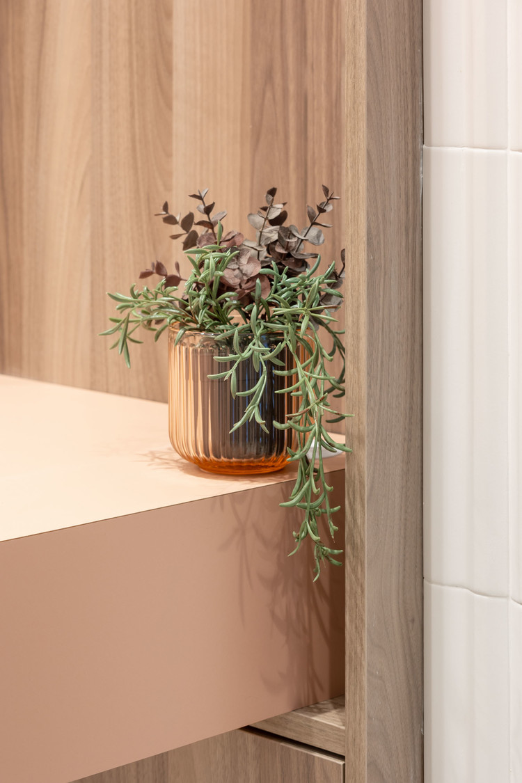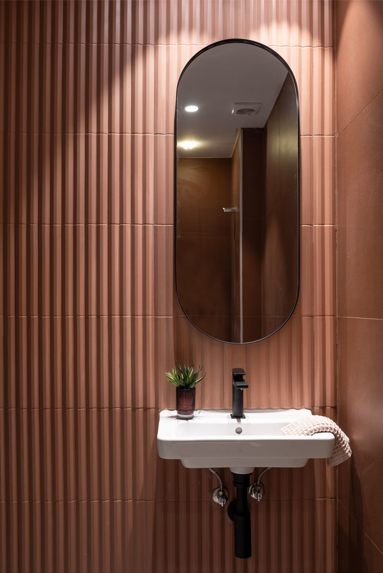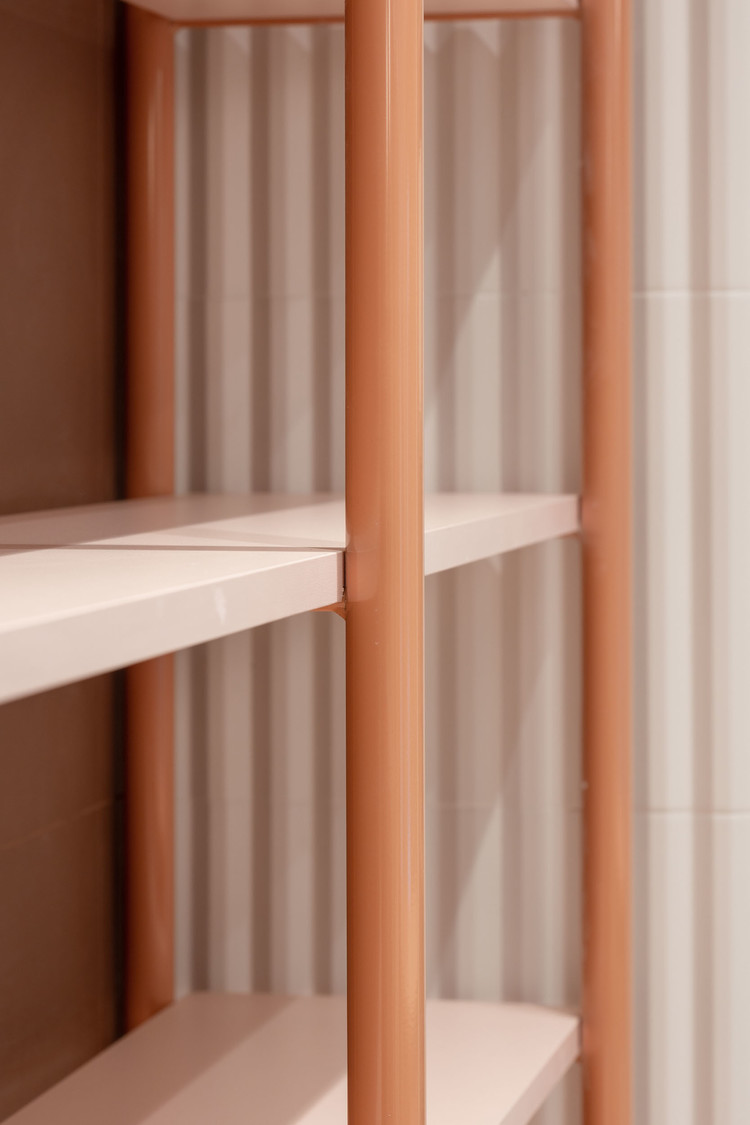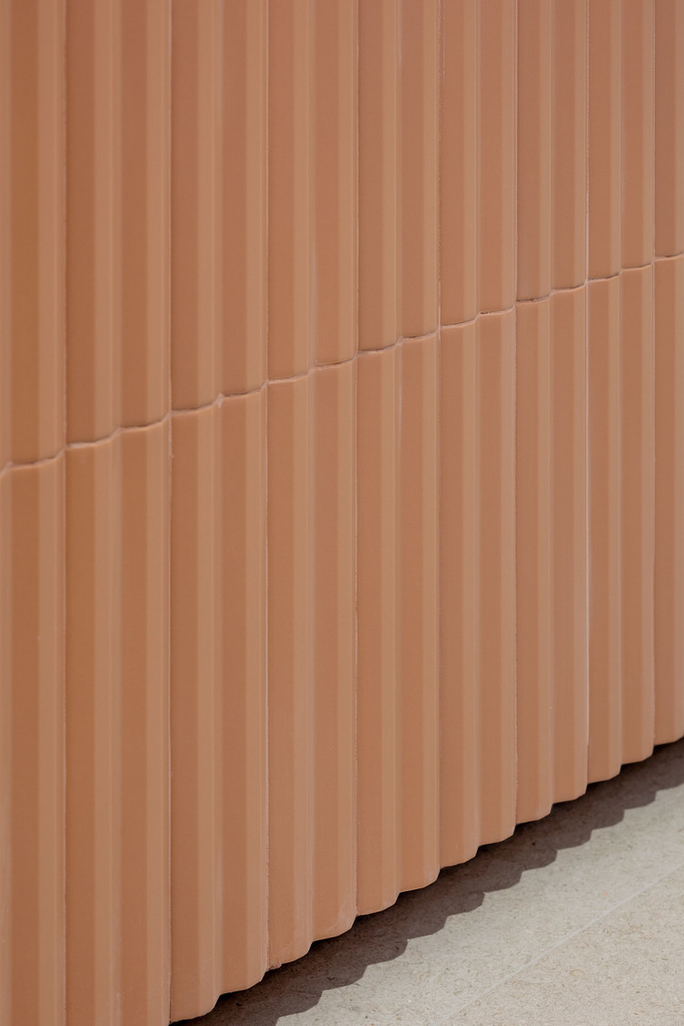 En los detalles hay un diálogo entre la cerámica estriada de paredes y mostradores. La fría precisión del tubo de hierro con la amabilidad del color.