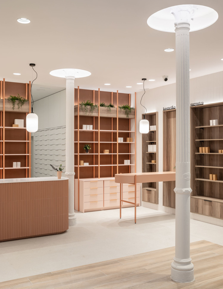El proyecto comienza con la aproximación a un lugar lleno de carácter, un espacio con esbeltas columnas de hierro fundido que nos transportan a otra época, que es también la del monumento que da nombre a la farmacia: el puente-transbordador, conocido por todos como puente colgante, que une Portugalete y Las Arenas por encima del río Nervión, un hito Vizcaíno y del Patrimonio Mundial.