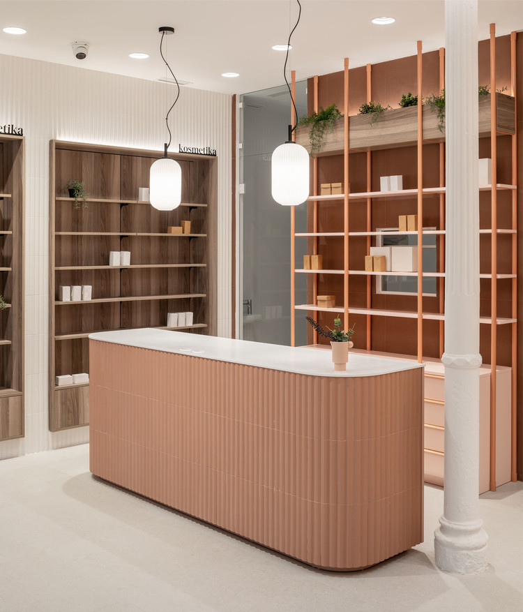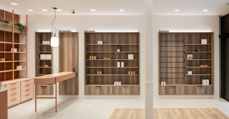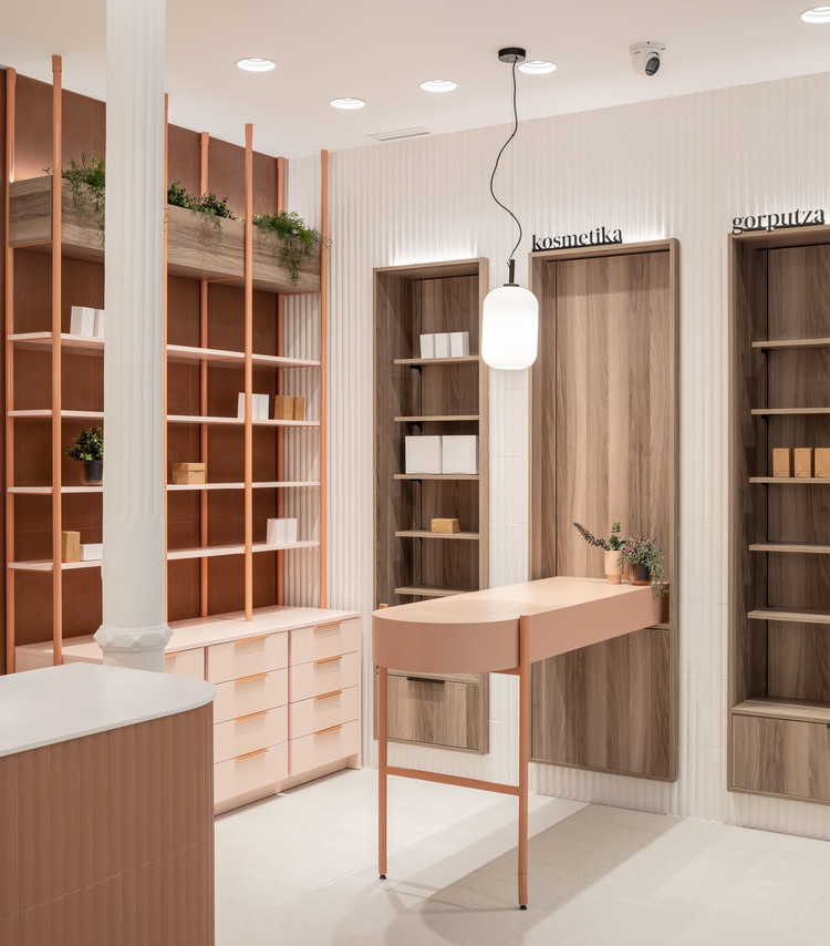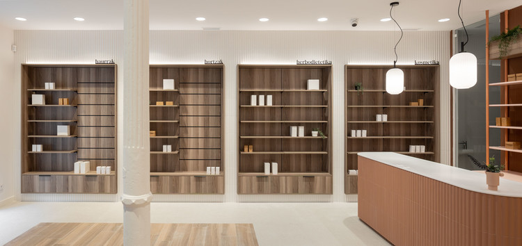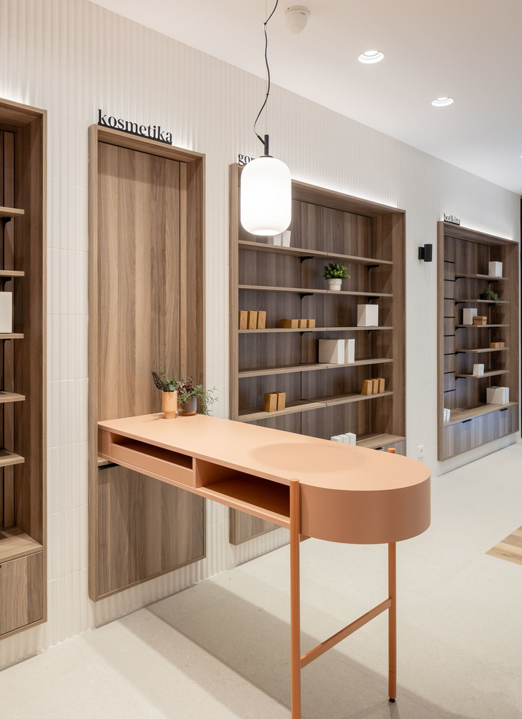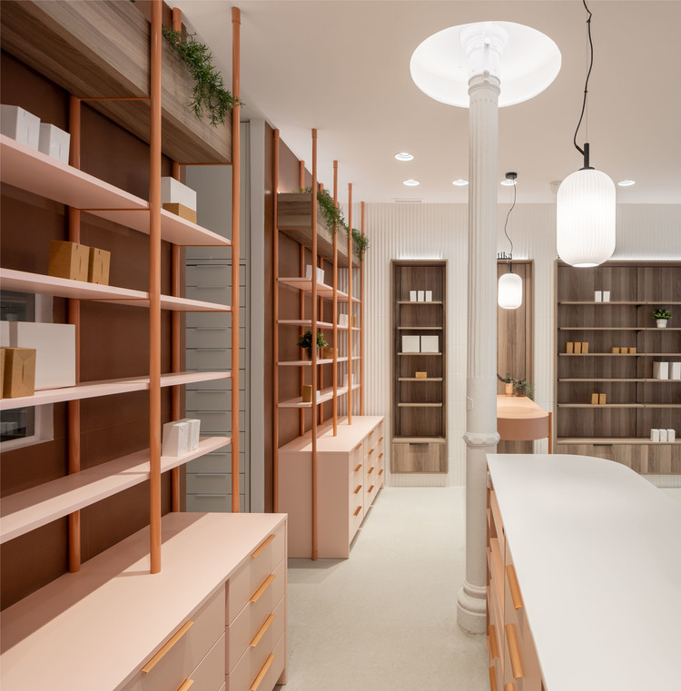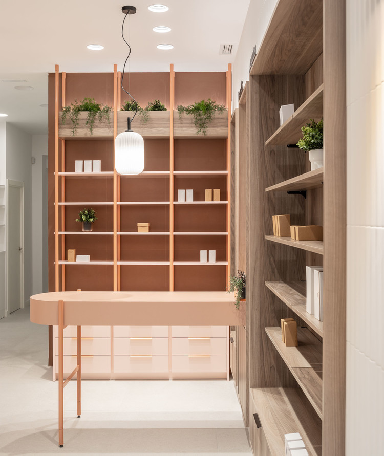 El almacenamiento de medicamentos está en una zona visible desde la parte pública de la farmacia, posibilitando la continuidad de la atención, donde el farmacéutico no tiene que desaparecer en la rebotica, sino que puede haber un diálogo ininterrumpido.