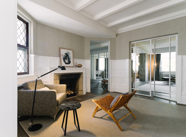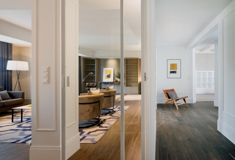 Los elementos sobre los que pivota el proyecto son la luminosidad del predominio de tonos claros junto al juego de iluminación indirecta, en claro contraste con el plano del suelo realizado con tarima de roble teñido. Este último procede de una casa austríaca especializada en procedimientos de corte de la madera para conseguir una veta inigualable. En el vestíbulo se han conservado y restaurado la chimenea y los panelados de madera de castaño originales.