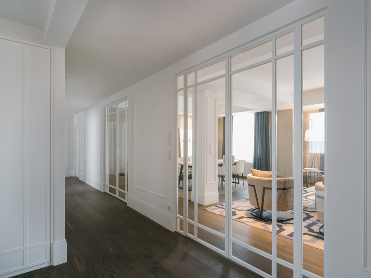 El recibidor de la vivienda, el pasillo y el espacio de salón se entienden como elemento unitario, capaz potenciar la sensación de amplitud, miradas cruzadas interiores y vistas hacia la ciudad. Las mamparas de acero lacado y vidrio permiten la división de los espacios anteriores para adaptarse a los diferentes usos de la vivienda y momentos del día. Gracias a su transparencia, estas divisiones permiten que desde el momento que se accede a la vivienda se disfrute la luz y la presencia de los árboles del parque de Doña Casilda.